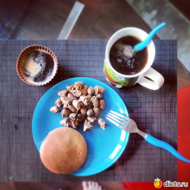 кофе черный, лепешка дюкана и куриные сердечки. еще вчера вечером к нам в гости приехала подруга, с которой мой муж весь вечер меня искушали поесть с ними пиццы и чипсов, которые они уминали весь вечер под ром. но я была непреклонна, и стойко тянула воду и чаёк, а потом решила сделать на утро желе из колы лайт.