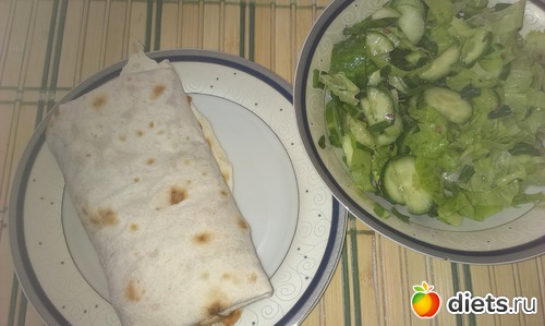 обед: овощной ролл в этот раз внутри..овощи..тушёные...получилось более вкусно...и салатик из огуречиков...и чай пила...