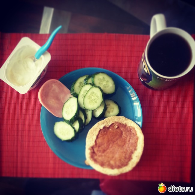 завтрак: лепешка из отрубей, огурец, кусок ветчины, творог с сахзамом и ароматизатором кокос и кофе