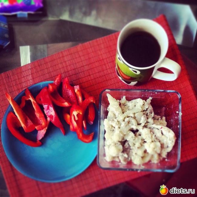 вот так вот вышло что на завтрак у меня был обед - то же что и вчера, курица с цветной капустойи красным перцем вприкуску