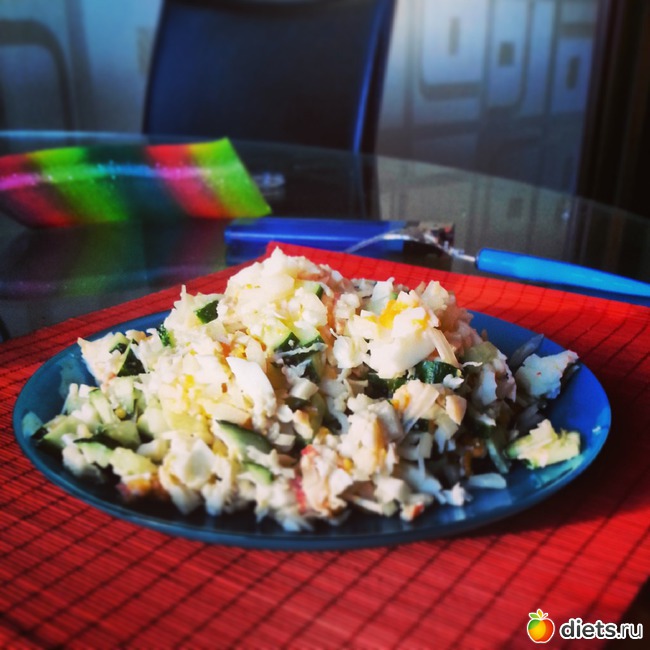 ну, а на ужин я сделала салат из огурцов, лука, снежного краба и яиц. хотела туда еще икры положить - но потмо вспомнила какой ужас получился ней прошлый раз