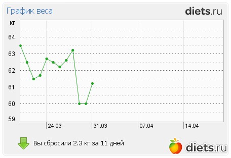 Вес 61.2, хотя вчера весь день провела в постели и ничегошеньки не ела, только чай и воду пила, но меня устраивает этот вес, медленно но верно ползёт вниз. Читать полностью