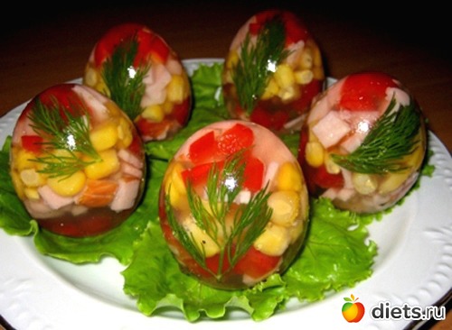Затем аккуратно положить в яйца различные продукты, залить желе и поставить в холодильник застывать.