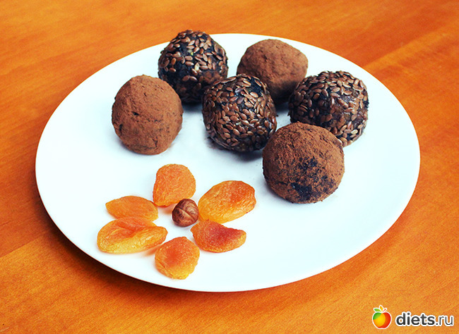Погружаем чернослив и курагу в кипяток на минут 5-10. Измельчаем орехи в бледере или комбайне. Сливаем воду из сухофруктов и отправляем к орехам. Снова перемалываем и затем добавляем мед. Из получившейся массы делаем шарики, кладем в два отдельно подготовленных пакета с какао и льном. Обваливаем наши шарики и отправляем в холодильник. Впрочем, пробовать их можно уже сразу, но после холодильника они будут еще приятней. Так же можно экспериментировать и с другими орехами, разнообразить посыпку (напр. кокосовая стружка, кунжут, мак...), у меня оказалось только 2(точнее был еще цветной сахар, но тот органично вросся цветом в конфетки)))