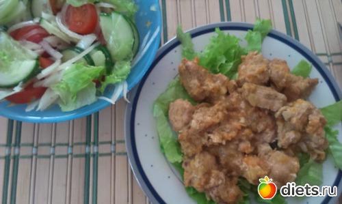 Обед:курогрудь замаринованная в соевом соусе...и потушенная с овощами...салатик и чай...