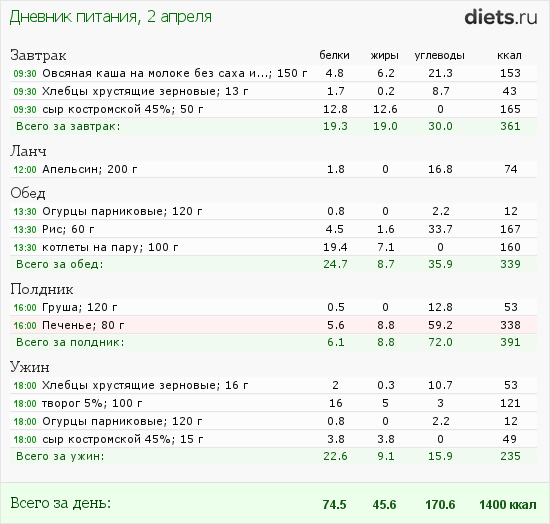Я укладываюсь в свои рамки свободно. Такой рацион мне позволяет выделять в день один жирный прием пищи (это обычная проблема моя)