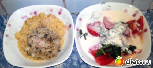 Помидорка с ряженкой. Не понравилось подобное сочетание. Лучше было помидорку просто порезать, посолить и съесть, не изображая салата. Пшено и изготовленная вчера фрикаделька.