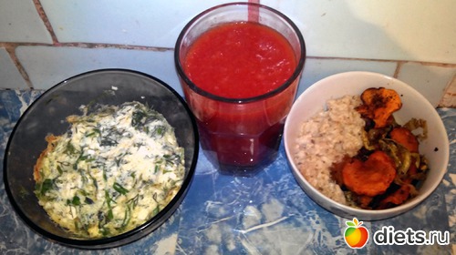 Геркулес с запеченными овощами, запеканка из творога и яйца с зеленью и томатный сок.