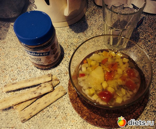 Завтрак - суп "Президенсткий", 4 кукурузных палочки с шоколадом и арахисовым маслом