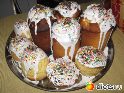 11. Вынимать пасхи, и пока они горячие – смазывать их этим белком и тут же посыпать цветной присыпкой и другими пасхальными украшениями)