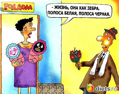 Мужа впускают в палату, где лежит жена с новорожденным. Он ее обнимает, целует, плачет. И, заглянув в кроватку, видит - ребенок черный. Муж в ужасе отскакивает, а жена, не дав ему опомниться, кричит: