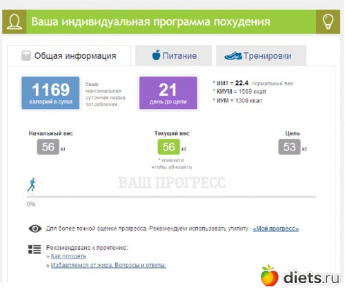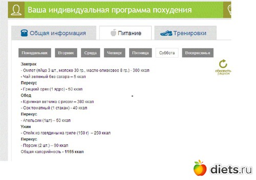 Это сайт по похудению. В нем можно так же вести дневник. Чем-то похож и на сайт "Живи", только у Живи платить нужно. А здесь бесплатно. В личном кабинете есть вкладки "Питание" в ней рацион на 7 дней, который можно обновить с калорийностью не выше рассчитанной, "Тренировки" - здесь комплексы упражнений с описанием техники выполнения и даже видео. Перед составлением программы нужно внести свои данные, сколько раз в неделю планируешь заниматься и с каким инвентарем.