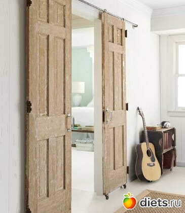 Для работы понадобятся: дверное полотно без фурнитуры, колесики, металлический карниз (помните о длине карниза – она должна быть минимум в два раза больше самой двери), металлические петли, краска, гвозди, шурупы, дрель.