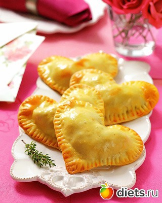 4. Соберите обрезки с оставшимся тестом и вновь раскатайте. Вырежьте еще 12 сердечек и переложите их поверх начинки, равномерно придавливая края вилкой по всему краю. В центре каждого пирожка сделайте маленькую дырочку, чтобы выходил пар. Смажьте пирожки яичной смесью и выпекайте 20-25 минут. Подавайте в горячем виде в качестве закуски или с салатом.