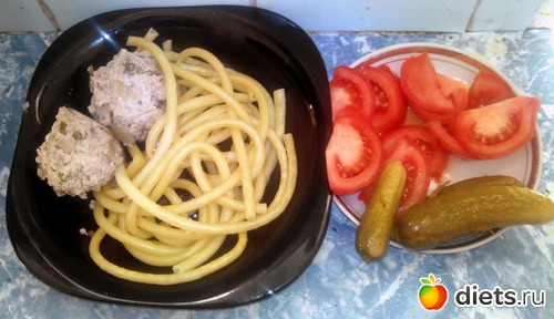плюс помидорка, пара маринованных огурчиков и фрикадельки из куриного фарша.