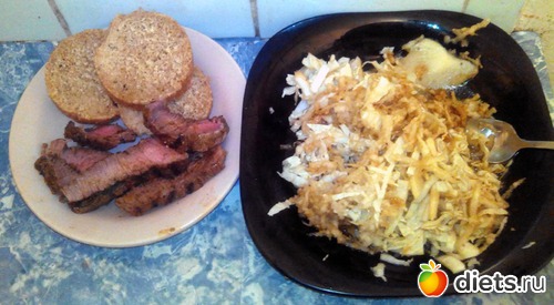 Салат из пекинки и дайкона. Хлеб и говядина, приготовленная вчера. Вот она мне понравилась! Хорошо жуется!
