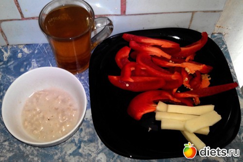Еще немного геркулеса, сладкий перец, сулугуни. Зеленый чай.