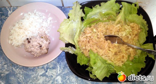 Тертая редька с ряженкой на листьях салата. Отварной рис и фрикаделька из куриного фарша с луком.