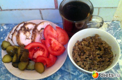 Отварная чечевица, пара маринованных огурчиков, помидорка и запеченная куриная грудка. Чай.