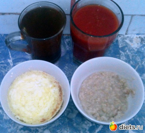 Геркулес, запеканка, томатный сок и зеленый чай.