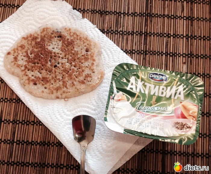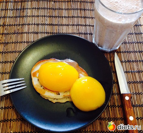 Завтра - один оладушек с карамельным соусом и персиками, молочный шейк на основе банана и черного шоколада