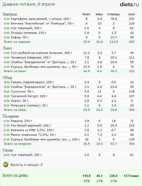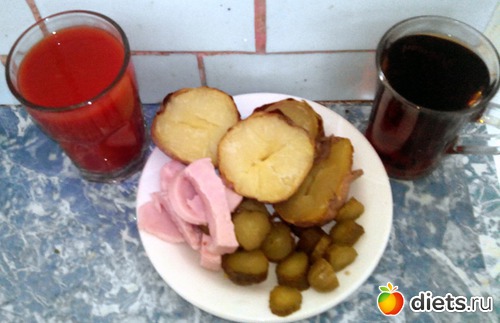 Запеченный картофель, немножко не очень калорийной ветчины, маринованные огурчики, томатный сок и чай. Потом подумал и съел еще зефирину.