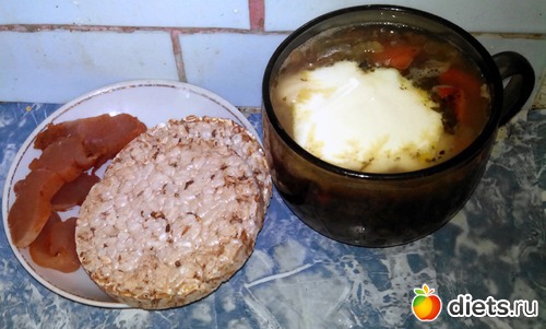 Суп с грибами, что сварил вчера, слайсы и немножко той самой вяленой куриной грудки, что я делал в прошлую субботу.