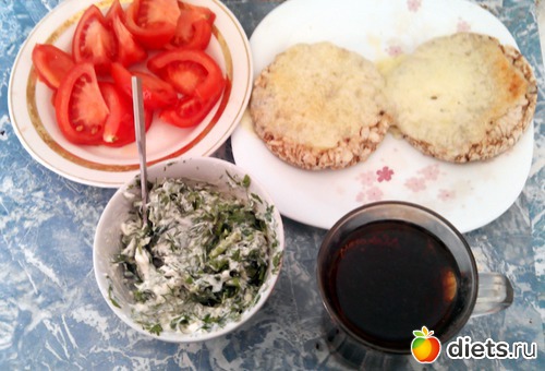 Помидорка, что-то вроде пасты из зелени и греческого йогурта, слайсы и сулугуни. Сыр я положил на слайсы и сунул в на минуту в микроволновку. Чай.