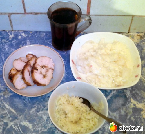 Дайкон с ряженкой, рис с небольшим количеством масла, но без соли. Запеченная грудка и чай.