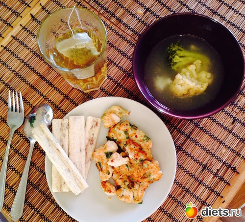 Завтрак - 1 половник супа из цветной капусты, 2,5 рубленных котлетки, 4 кукурузных палочки с шоколадом и стакан зеленого чая с черникой