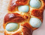 Концы с одной стороны жгутов защипать вместе и сплести жгуты в косичку, вставляя в сплетения сваренные вкрутую яйца. Яйца вставлять достаточно глубоко, т.к. при расстойке и последующей выпечке тесто будет выдавливать их наружу.