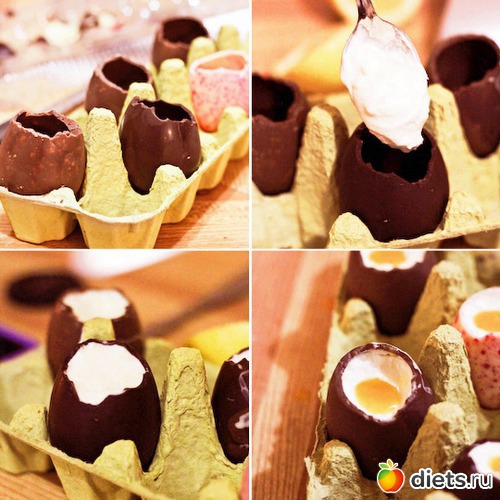 СОВЕТ: шоколадные оболочки и удобно хранить и наполнять, используя упаковку от яиц, которую надо выстелить пленкой.