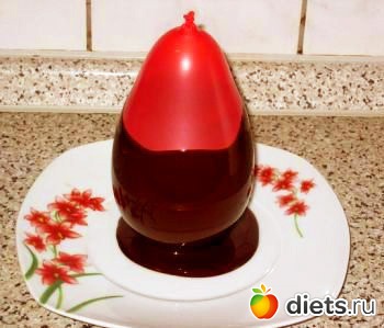 Залитые холодной (ледяной) водой воздушные шарики обмакиваем в шоколад (можно 2 раза с небольшим перерывом), держим на весу до затвердения шоколада (сразу ставить нельзя, т.к. шарик от веса начнет расплываться).