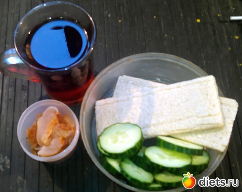 Вяленое куриное мясо, хлебцы и огурец. Плюс чай.