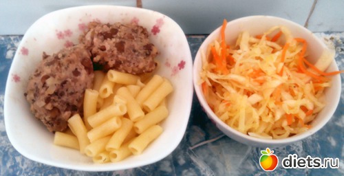 Овощной салат, макароны и фрикадельки из куриного мяса, чечевицы и лука. Так как они ничем не отличаются от курино-чечевичных котлет, то и я посчитал фрикадельки как котлеты.