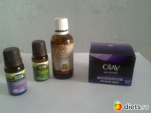 За основу взяла Olay ночной крем и добавила масло лаванды, пихты и макадамии. Соединила масла исходя из того, что они подходят именно для сухой кожи и сочетаются друг с другом.