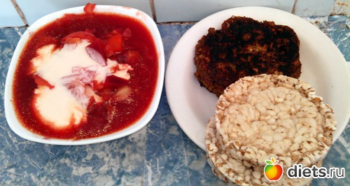Борщ с грибами, чечевично-грибные котлеты и пара слайсов.