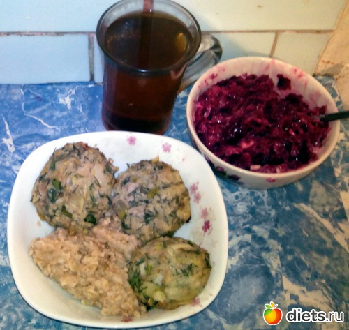 Отварная тертая свекла с ряженкой и чесноком. Геркулес и фрикадельки из куриного фарша, лука и яблок.