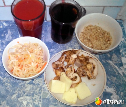 Овощной салат. Геркулес. Остатки запеченной грудки и немного сулугуни. Томатный сок и чай.