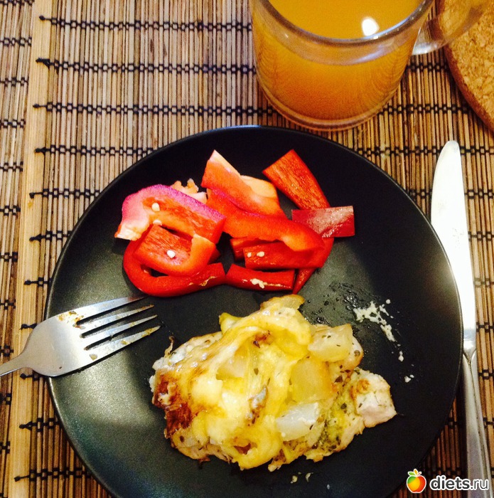 Ужин - куриная отбивная с ананасами, перчик, сок