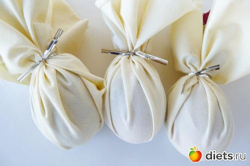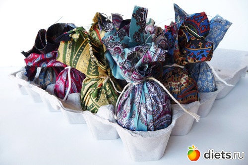 После этого яйца стоит обернуть еще раз — в светлую и легкую ткань, хлопок. Старая наволочка, простыня, скатерть отлично подойдут для этого. Если вы уж выбрались в секонд-хенд за галстуками, там же можно подыскать что-то подходящее для второго обертывания.