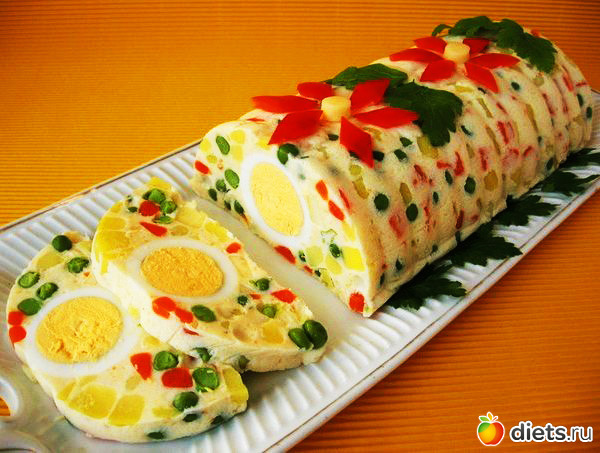 В 200 мл овощного бульона замочить на 40 минут желатин, затем подогреть при помешивании до растворения желатина (не кипятить), дать остыть до легкой теплоты (не выше температуры тела), смешать с майонезной смесью и заправить подготовленные продукты.
