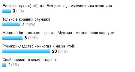на самом деле-не понимаю рукоприкладства в принципе. люди с интеллектом могут практически любой конфликт урегулировать не опускаясь до уровня первобытного человека. вот такое моё ИМХО