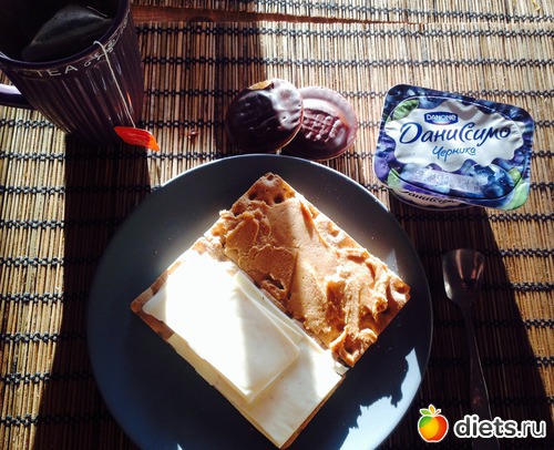 Завтрак пятницы был таким : хлебец с плавленным сыром, хлебец с арахисовым маслом, Даниссимо с черникой, 2 печенюшки и зеленый чай