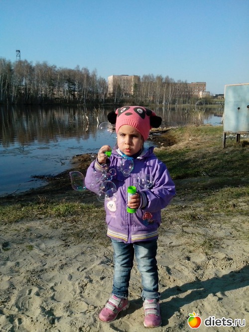 В субботу было много дел! Сначала мы проснулись и погуляли с Таей и собакой. Разговорились с соседкой из дома напротив - она меня соблазнила на мытье машины... Сначала я сомневалась, но глянув на свою машинку непонятного колеру, я решилась на это. Взяли мы ведро, тряпки и стали мыть машину. Дочка мне помогала изо всех своих трехлетних сил! Умничка моя! Через полтора часа, три ведра воды и кучу грязных тряпок, я наконец вспомнила, что машинка моя БЕЛОГО цвета! Настолько она была грязна, что родной цвет был виден только на крыше! Потом, я съездила забрала мужа с электрички, а после мы поехали освящать куличи и яички. Погода стояла чудесная, пели птицы, светило солнце, такая благодать была! Прям не хотелось уезжать из храма! Вечером прогулялись еще раз по озеру и деревне. Вот бабочки загорают на березе... А вот моя красота мыльные пузыри пускает! А вот деревья распускаются! И небо чистое-чистое! Красота!!! Питание в субботу было такое: завтрак - рисовая каша на молоке, элавия, 2 кусочка рулета запеченного домашнего (свинина+курица+сало+специи), перекуса не было, обед - суп харчо (ужасно жирный, на баранине), чай черный без сахара, полдник - кофе + 4 мармеладки; ужин - овощной салат и шашлыыыык! Отвела душу! Воскресенье - Великий праздник. Ничего не делала! Только гуляли! Питание: завтрак - каша овсяная, 2 яйца, кусок кулича, чай черный; перекус - яблоко; обед - суп харчо, чай, кулич; ужин - гречка с тушеной свининой с грибами, чай, кулич... Наверное, я не единственная, кто скушал столько кулича за вчера, поэтому мне совсем не стыдно! Да и получился кулич ооооочень вкусным! Этот рецепт я точно буду использовать еще не раз!