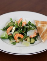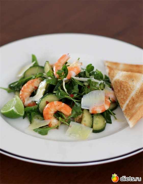 Смешать в миске огурец, креветки и салат (я использовала кресс-салат, можно взять листовой салат, корн или другой).