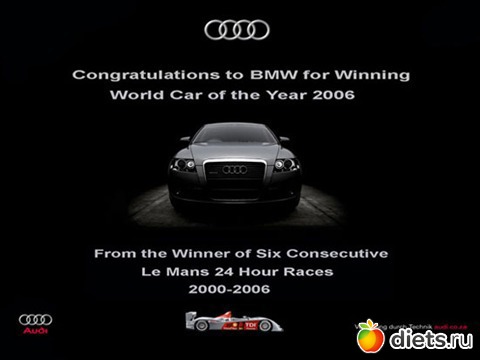 Audi скрывать обиды не стала, выступив с ответным постером: «Поздравляем BMW c победой в конкурсе «Машина мира»-2006. От шестикратного победителя гонок Consecutive Le Mans 24 Hour (2000—2006).»