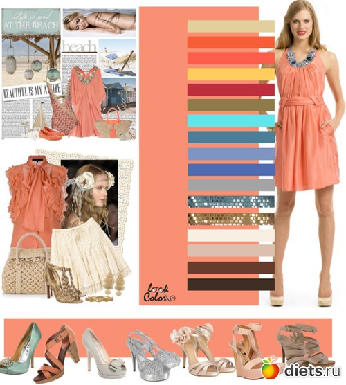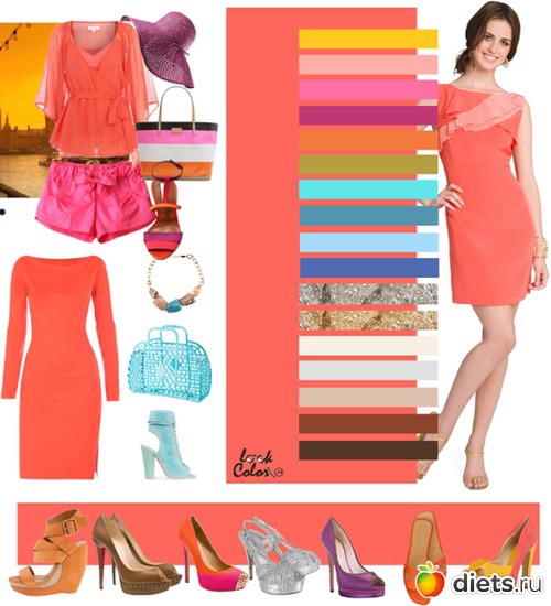 Рассмотрите сочетания с коралловым ярким розово-оранжевым цветом желто-зеленого, лилового, желто-лилового, помидорного, песочного, зеленого, лазурного, небесно-голубого, цвета черного моря, темно-синего, серебряного, золотого, бело-бежевого, телесно-белого, серого, коричневого, темно-коричневого.
