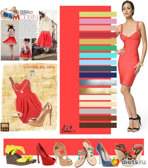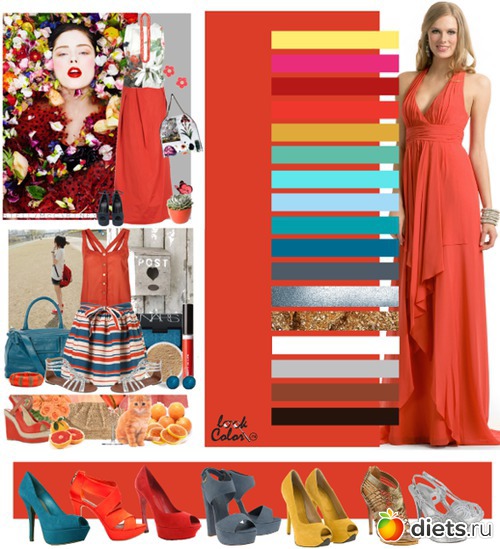 Не плохое сочетание кораллового красно-оранжевого цвета со светло желтым, розово-оранжевым, ярко-розовым, ярким розово-оранжевым, темно-бордовым, приглушенным желто-оранжевым, с цветом весенней зелени, берлинской лазурью, серым, сиреневым, золотым, серебряным, белым, песочно-светло-бежевым, темно-серым, коричневым, темно-коричневым.