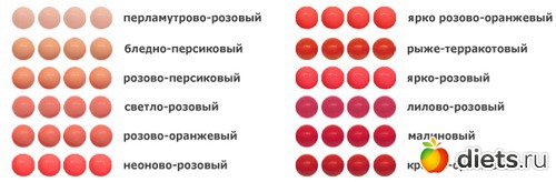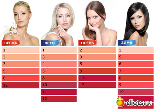 Для «весны» предпочтительней теплые оттенки, хотя холодные ее не испортят так как, например, яркие цвета «лето». «Весне» к лицу перламутрово-розовый оттенок коралла (1), бледно-персиковый (2), розово-персиковый (3), розово-оранжевый (5), яркий розово-оранжевый (6) и кораллово-красный (12).